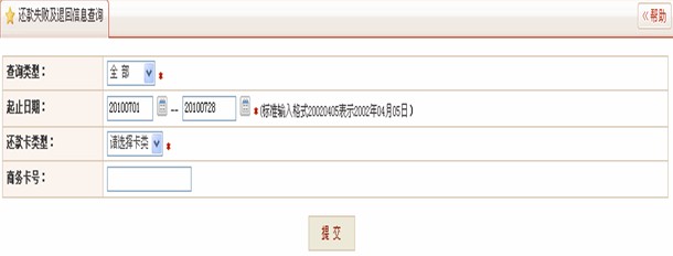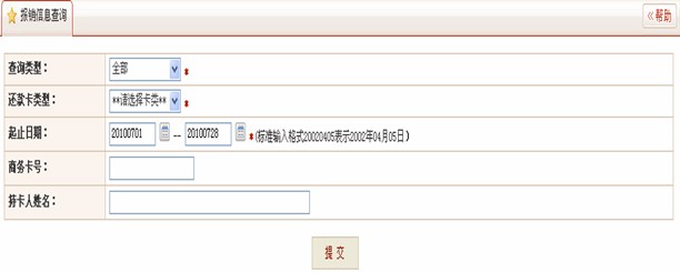 1.4 示例【商务卡报销信息登记】 1.5 注意事项 初次进行商务卡报销时,必须首先进行报销用途维护。 报销信息登记时,商务卡号(或持卡人姓名)及消费日期、金额必须与系统中信息一致,才可提交。 还款由系统当日日终批处理进行,次日可查询还款结果。 办理借记卡还款业务必须在签约时,指定借记卡账号。 2 报销查询 2.1 功能介绍 可进行商务卡报销业务处理过程中,各个环节的处理结果状态查询,以及消费明细、持卡人信息等信息查询。 2.2 操作流程 2.3 示例 消费明细查询: 报销信息查询: 报销单信息查询: 还款失败及退回信息查询: 持卡人信息查询: 操作员日志查询: 2.4 注意事项 在进行报销信息查询及持卡人信息查询时,“商务卡号”及“持卡人姓名”必输其一。 消费信息需在消费日次日进行查询。 还款失败及退回信息需在还款日次日进行查询。